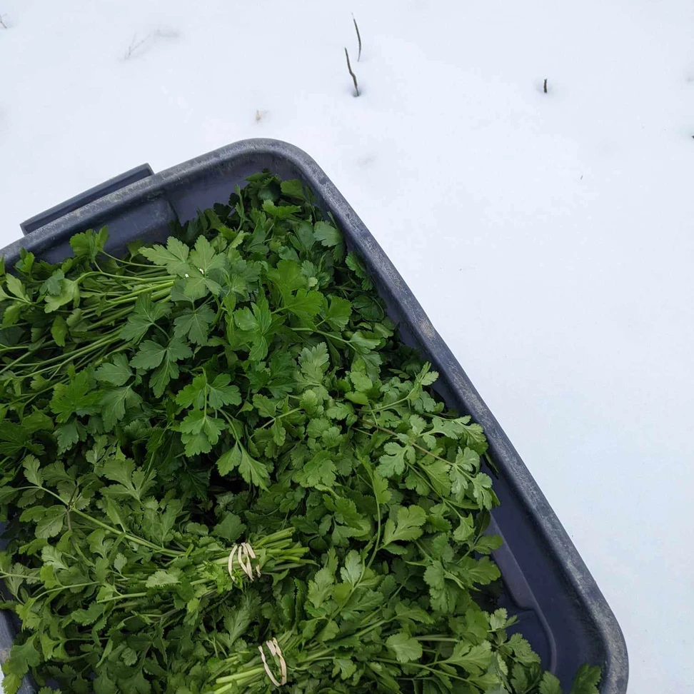 Les serres vibrent littéralement grâce à toute la photosynthèse qui s'y déroule ! De plus, nous avons des milliers de mètres carrés de légumes verts et d'herbes aromatiques dans les champs que nous continuons à récolter.